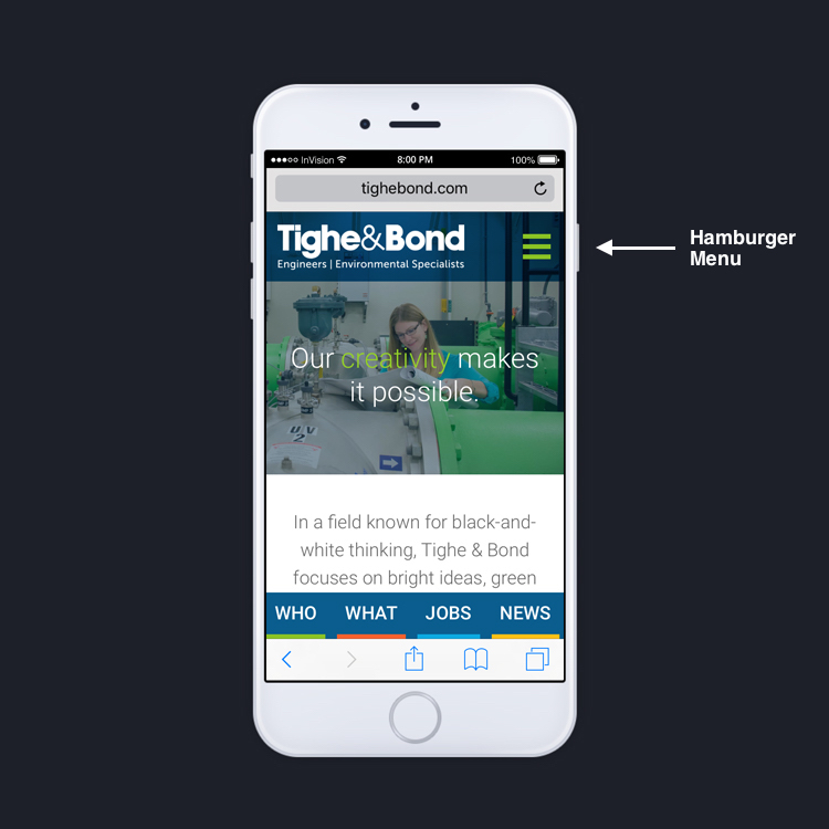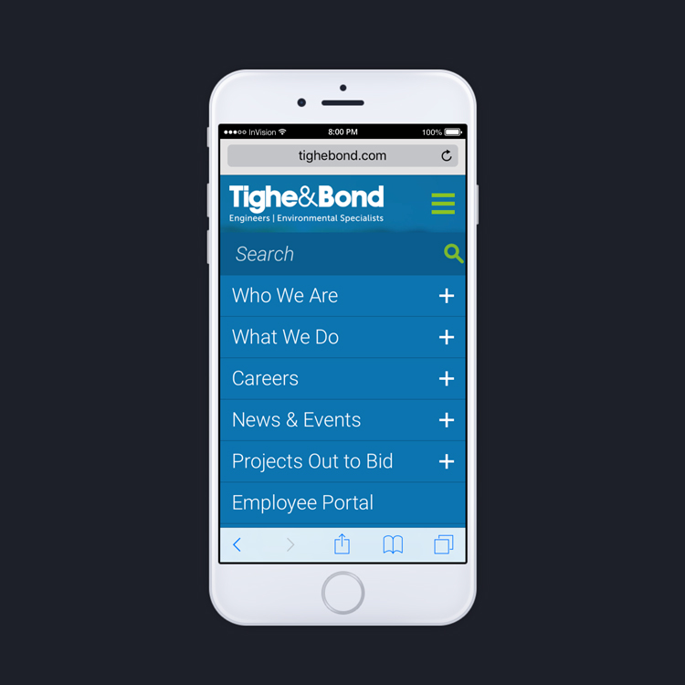Hamburger menus make sense and function well on mobile devices. In addition to using the hamburger menu, we’ve found that using what’s called ‘Bottom Navigation‘ helps users jump to the top three or four areas of the site, without clicking to open the hamburger menu. In the Tighe & Bond example below, you can utilize both the Hamburger and Bottom Navigation: ![]()