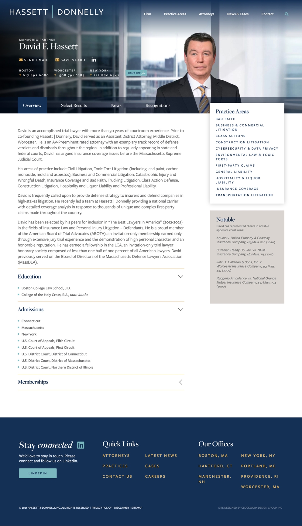 Hassett | Donnelly is an AV-rated litigation firm with offices throughout New England and New York. Their highly experienced trial lawyers specialize in handling complex litigation and have a proven track record of success. The new website showcases the firm’s attorneys, expanded geographic footprint, and case stories. Clockwork coordinated and art directed new portraits of the attorneys, refreshed the firm’s logo, and created a site announcement graphic to launch the new website.